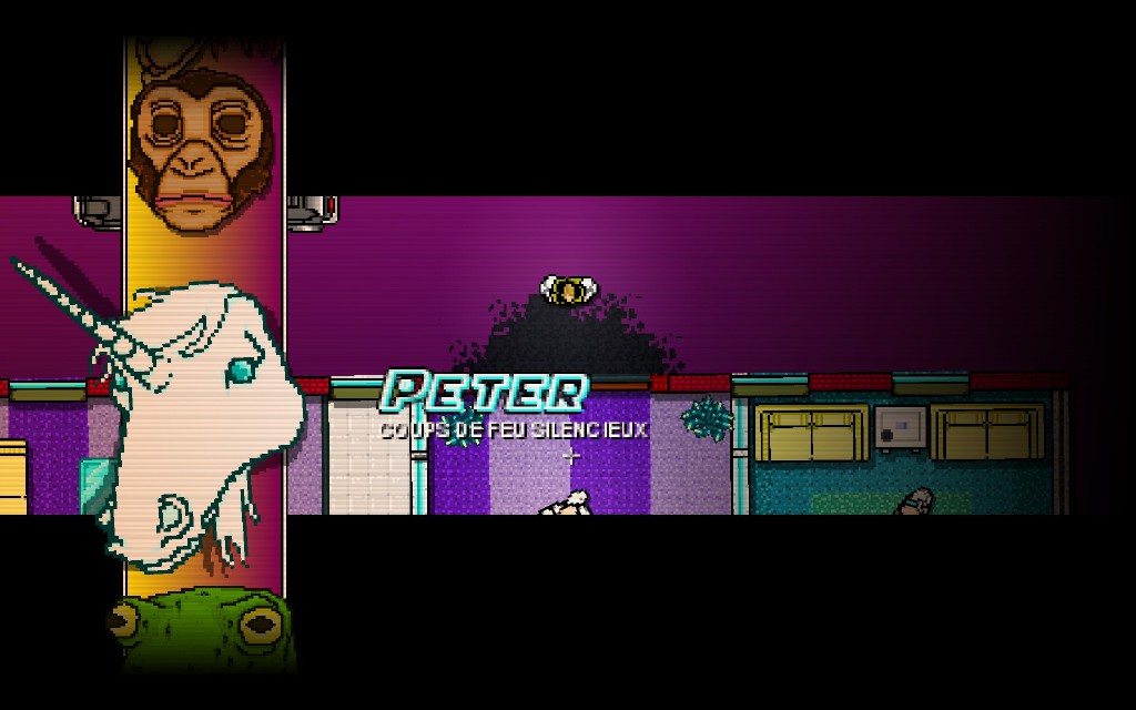 On le constate de plus en plus : les développeurs indépendants affectionnent le style « old-school ». Cela dit, indépendant, ne signifie pas forcément « rendu visuel dégueulasse », même si le jeu à été réalisé sous GameMaker. On aura beau dire ce qu’on veut le style « retro » colle à merveille, pour un titre se déroulant dans le Miami des 80’s. Et je sais pas pour vous, mais j’ai beau avoir retourné le titre dans tous les sens, quand je dérouille un mec, je me sens toujours aussi mal à l’aise. Le sang gicle de partout, les crânes s’enfoncent, et les boyaux s’éparpillent… Bref, c’est minimaliste, mais c’est classe… à sa façon.